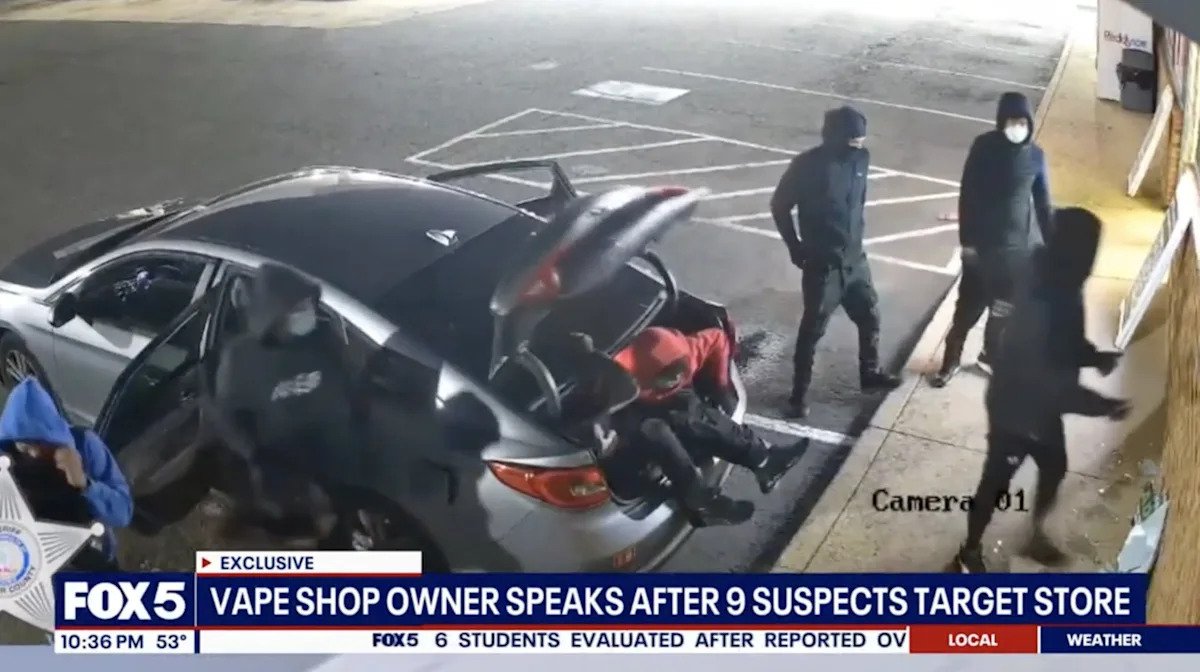 Las fotografías de vigilancia captaron el momento surrealista en el que nueve personas bajaron de un automóvil pequeño para saquear una tienda de cigarrillos electrónicos en Virginia en octubre.