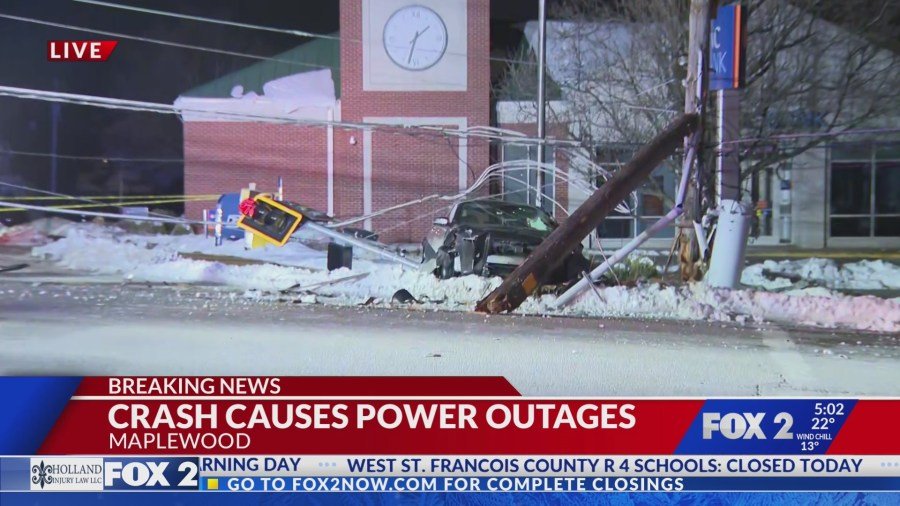 Condado de St. Louis, Missouri – Una persona resultó herida y cientos se quedaron sin electricidad el jueves por la mañana después de que un vehículo chocara contra un poste de servicios públicos durante la noche en Maplewood.