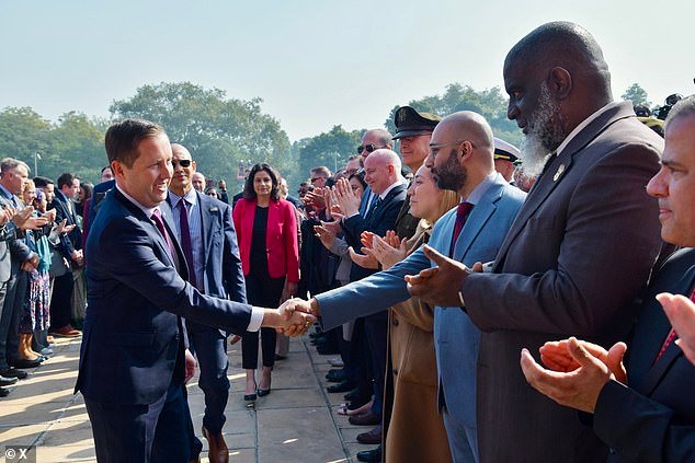 El recién nombrado embajador de los Estados Unidos en la India, Sergio Gore, da la bienvenida a los funcionarios a su llegada a la embajada de los Estados Unidos en Nueva Delhi el 12 de enero.