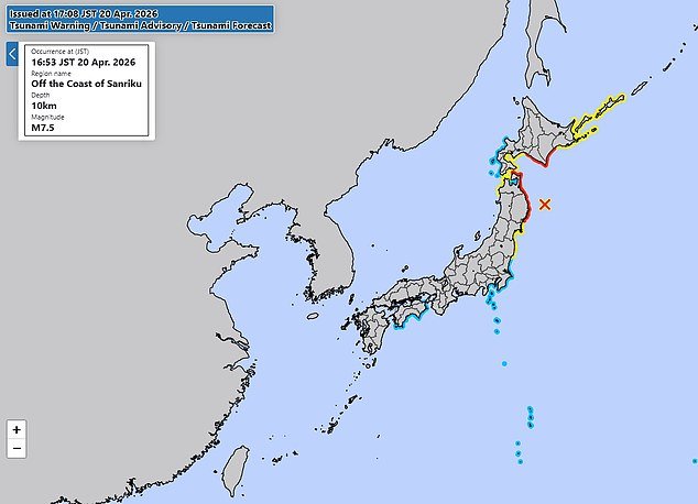 Se espera que una ola de tsunami de tres metros golpee la prefectura de Iwate y partes de Hokkaido “inmediatamente” después de que se registrara el terremoto de magnitud 7,5 a las 16.53 hora local (7.53 hora del Reino Unido).