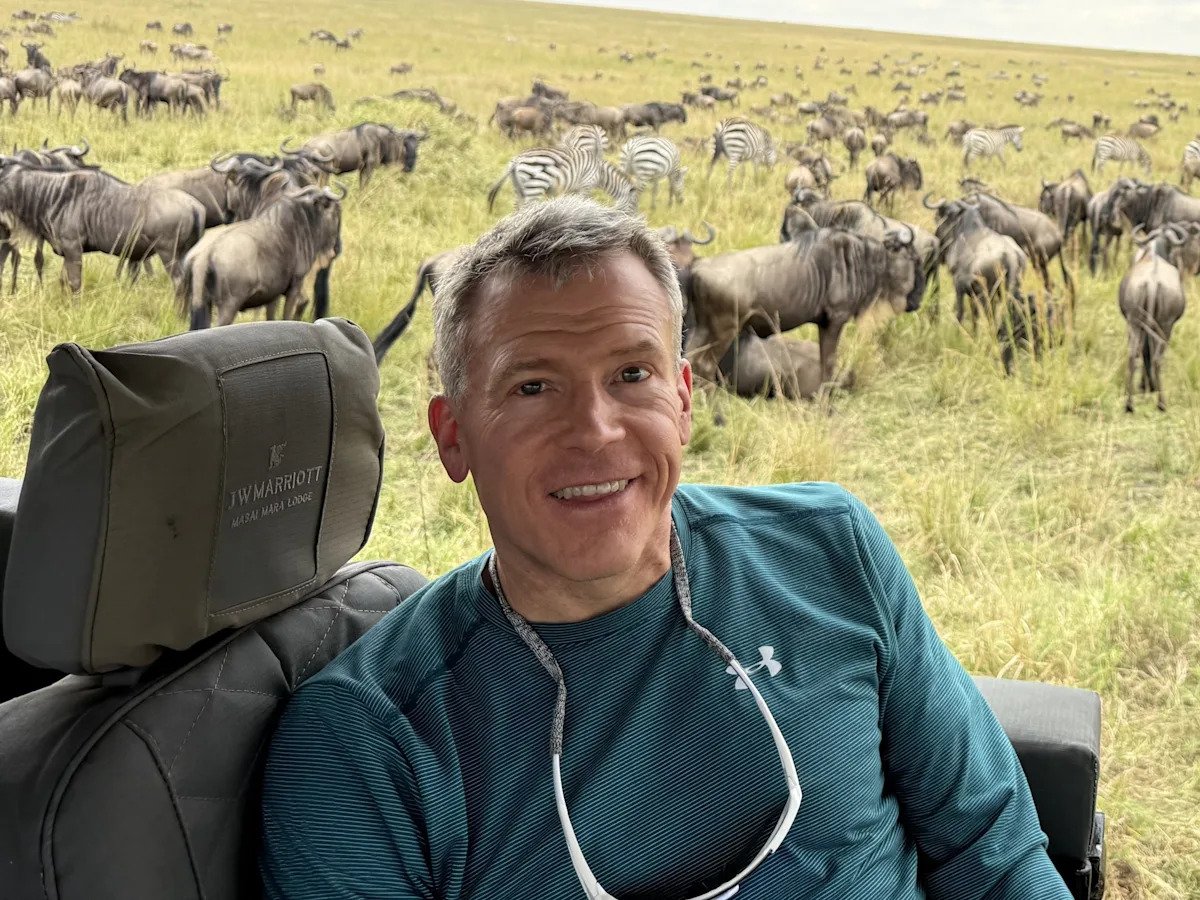 Scott Scovel sentado en un vehículo en un safari.