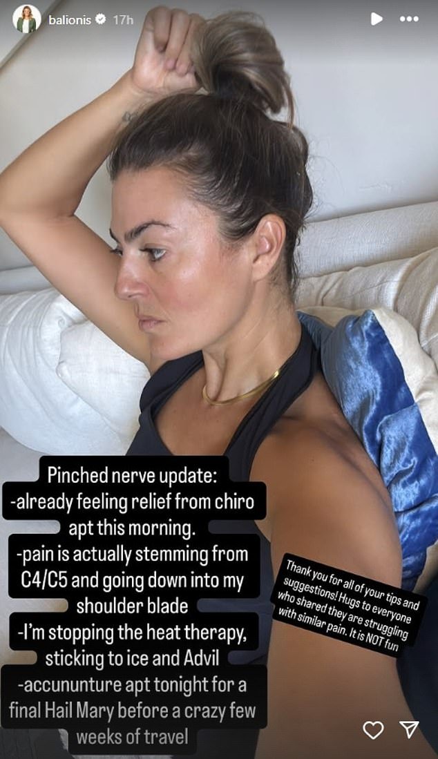 Con una selfie propia, Balionis escribió en Instagram el miércoles: ‘Pinch y la actualización del nervio: -me siento cómodo desde esta mañana (cita de quiropráctico). -Pen en realidad se está derivando de mi C4/C5 y está en mis omóplatos. Estoy fuera de la terapia de éxito, estoy en el hielo y la Advertencia -(cita de acupuntura) esta noche, una locura es para el granizo final antes de viajar unas semanas. ‘