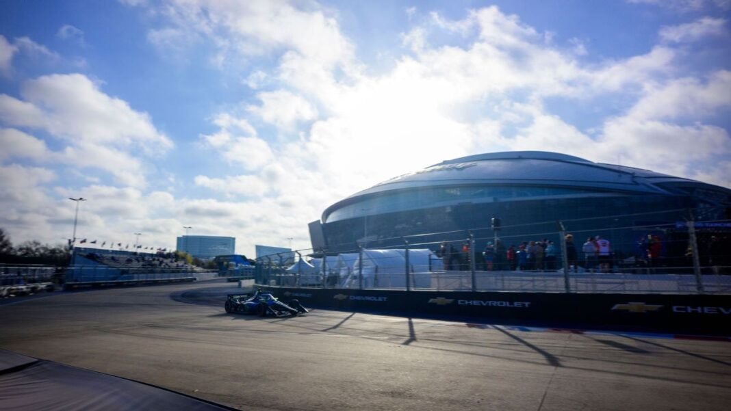 La práctica para el Gran Premio inaugural de Arlington se reanudó después de un retraso de varios minutos mientras los funcionarios de IndyCar probaban el circuito temporal de 2,73 millas y 14 curvas en la carretera que rodea los estadios de los Dallas Cowboys y los Texas Rangers.