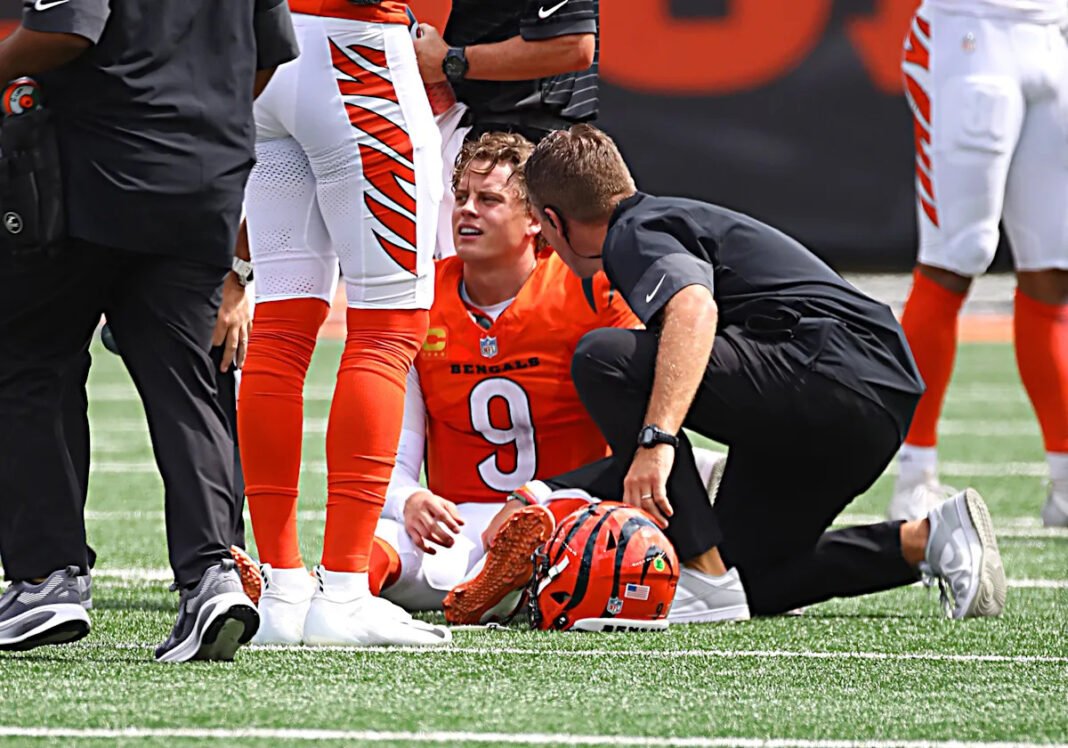 El mariscal de campo de Cincinnati Bungles, Joe Bureau, fue a la lesión de los pies izquierdos contra Jacksonville Jaguars la victoria del domingo 31-27.