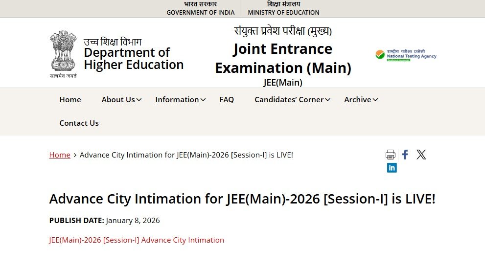 Calendario de la primera sesión de JEE 2026 revisado: La Agencia Nacional de Pruebas (NTA) ha anunciado un cambio en el calendario de exámenes de la Sesión 1 de JEE Main 2026. Hoy temprano, NTA publicó el cupón de la ciudad del examen en su sitio web oficial en jeemain.nta.nic.in. Según el calendario actualizado, la primera sesión está prevista del 21 al 29 de enero de 2026 y la próxima sesión del 2 al 9 de abril de 2026.