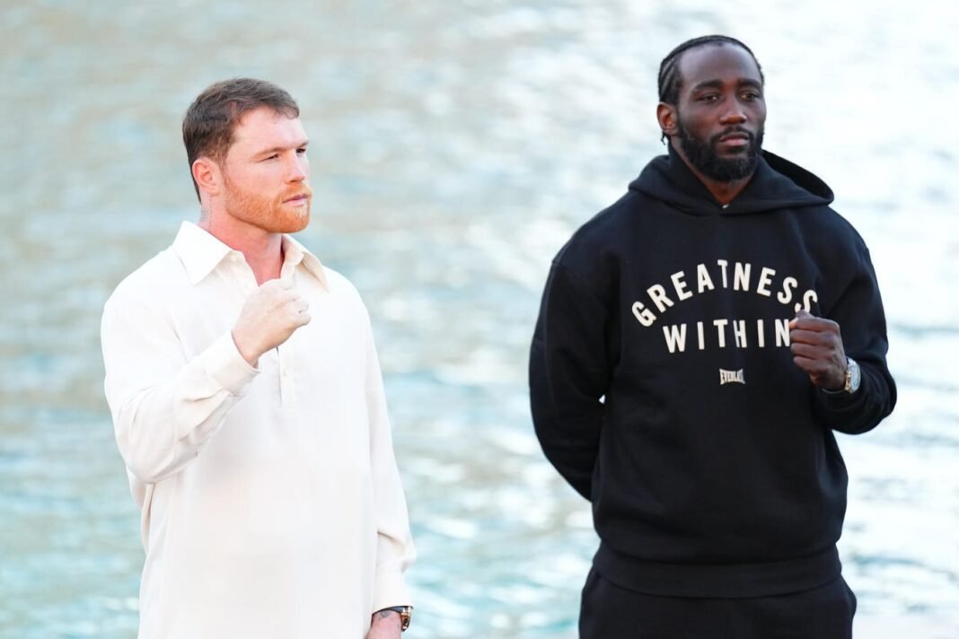 LAS VEGAS, NEVADA – 08 de septiembre: (LR) La pose de Canalo Alvarez y Terrence Craftdord es para los medios el 8 de septiembre de 2025, para los medios de comunicación de Nevada Las Vegas. (Foto de Chris Ugar/TKO Worldwide LLC/Fupha LLC a través de Gottie Image)