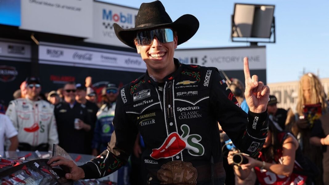 Después de pasar a Chris Buescher con un pase en la última vuelta el domingo, Hosever celebró con una de las vueltas de victoria menos convencionales de NASCAR. Encaramado en el alféizar de la ventana de su Chevrolet No. 77 para saludar a la multitud con los puños en alto y saludando con la mano, el larguirucho Hoseva logró mantener su mano izquierda en el volante mientras conducía hacia el frente.