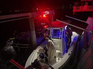 Un elevador de botes adjunto al muelle se había caído, lo que alentó a los servicios de emergencia a utilizar escuelas terrestres y recursos de rescate marino para acceder y evaluar la situación. Rescate de Bomberos del Condado de St. Johns en las redes sociales.