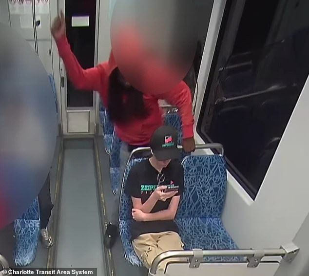 Las imágenes de CCTV del auto de tren ligero mostraron que su asesino de repente se puso de pie, completamente innecesario, luego cortó a algunos de los refugiados tres veces mientras estaba envuelto en su teléfono.