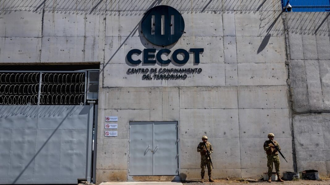 Tropas salvadoreñas hacen guardia afuera de CECOT, 15 de diciembre de 2025 en Tecoluca, El Salvador.