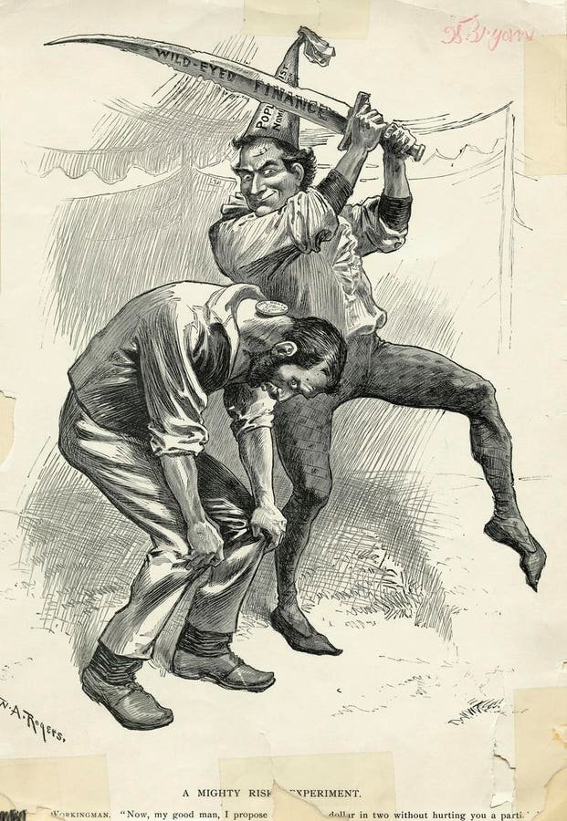 (Título original) Caricatura de William Bryan (1860-1925), candidato presidencial, populista en un “experimento muy arriesgado”. Grabado sin fecha que muestra a Bryan intentando dividir un dólar de oro en la nuca de un hombre sin llegar a romperlo.
