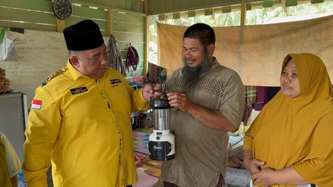 Dado que la electricidad no está disponible de manera uniforme, Golkar distribuyó luces de emergencia a los residentes de Aceh Tamiang.