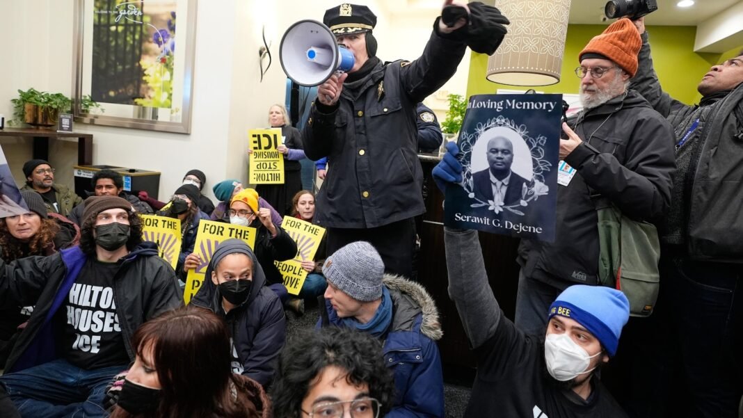 Nueva York– Decenas de manifestantes fueron arrestados el martes después de ocupar el vestíbulo de un Hilton Garden Inn en Manhattan, acusando al hotel de albergar a funcionarios federales de inmigración.