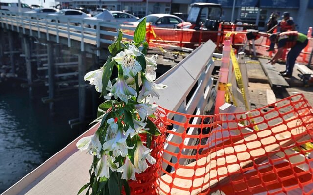 El lunes, se colocaron lirios en el muelle donde el vehículo chocó contra la barandilla y equipos de la ciudad de Santa Cruz están trabajando para reparar los daños.