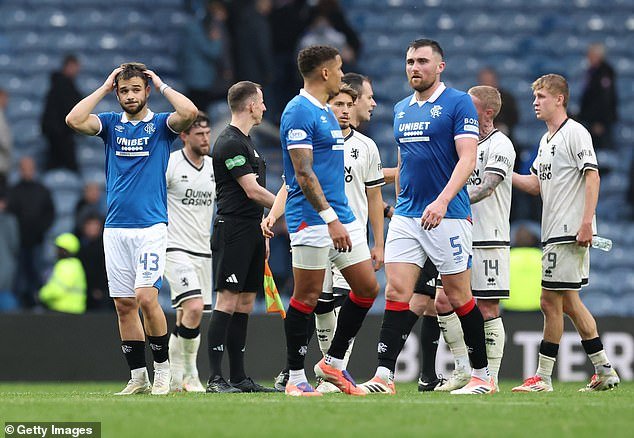 El pitido final vio un espectáculo familiar; Los jugadores del Rangers aplauden tímidamente a quienes mantuvieron su apoyo hasta el final. Cue levantó voces y señaló con el dedo entre la base.