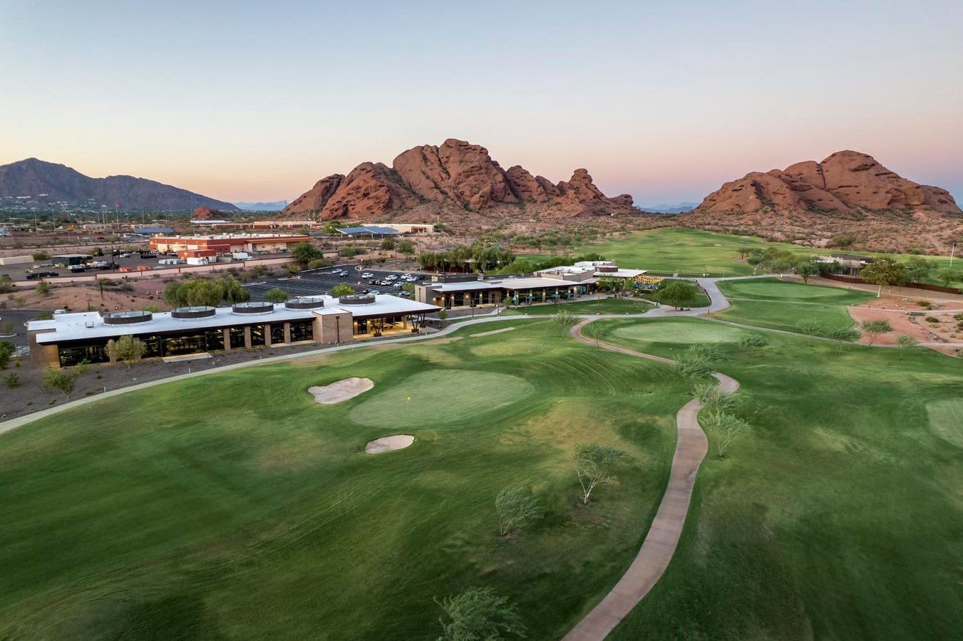 Vista aérea de Arizona Golf House a la izquierda del green 18 en Papago Golf Club. El salón de actos del club de golf, el Evie’s Pavilion y la casa club principal, que incluye Lou’s Bar & Grill, se muestran a la derecha de Arizona Golf House.