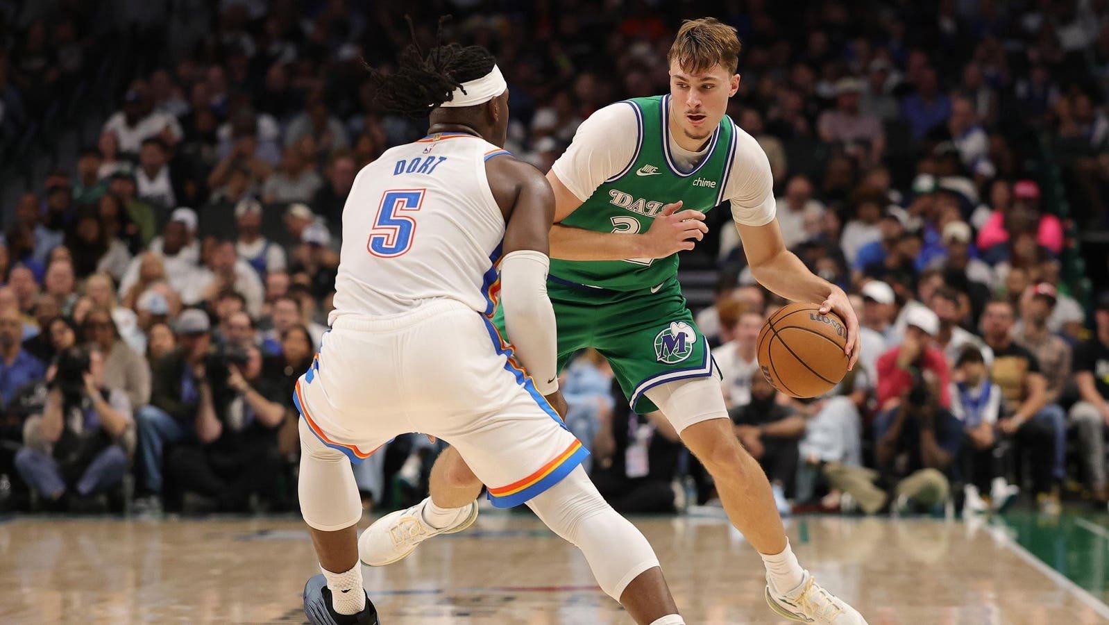DALLAS, TEXAS – 27 DE OCTUBRE: Cooper Flagg # 32 de los Dallas Mavericks es defendido por Luguentz Dort # 5 del Oklahoma City Thunder durante la segunda mitad en el American Airlines Center el 27 de octubre de 2025 en Dallas, Texas. NOTA PARA EL USUARIO: El usuario reconoce y acepta expresamente que al descargar y/o utilizar esta fotografía, acepta los términos y condiciones del Acuerdo de licencia de Getty Images. (Foto de Stacy Revere/Getty Images)