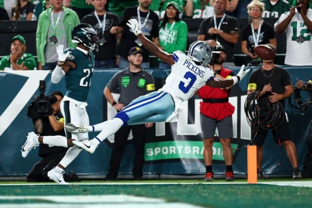 Filadelfia, Pennsylvania – 04 de septiembre: George Pickens de Dallas Cowbees #3 en Filadelfia, Pensilvania, el 4 de septiembre de 2025, en el Lincoln Finnial Field, Filadelfia AG contra Gols en la primera mitad del juego de fútbol de la NFL. (Foto Kevin Sabitus/Getty Image)
