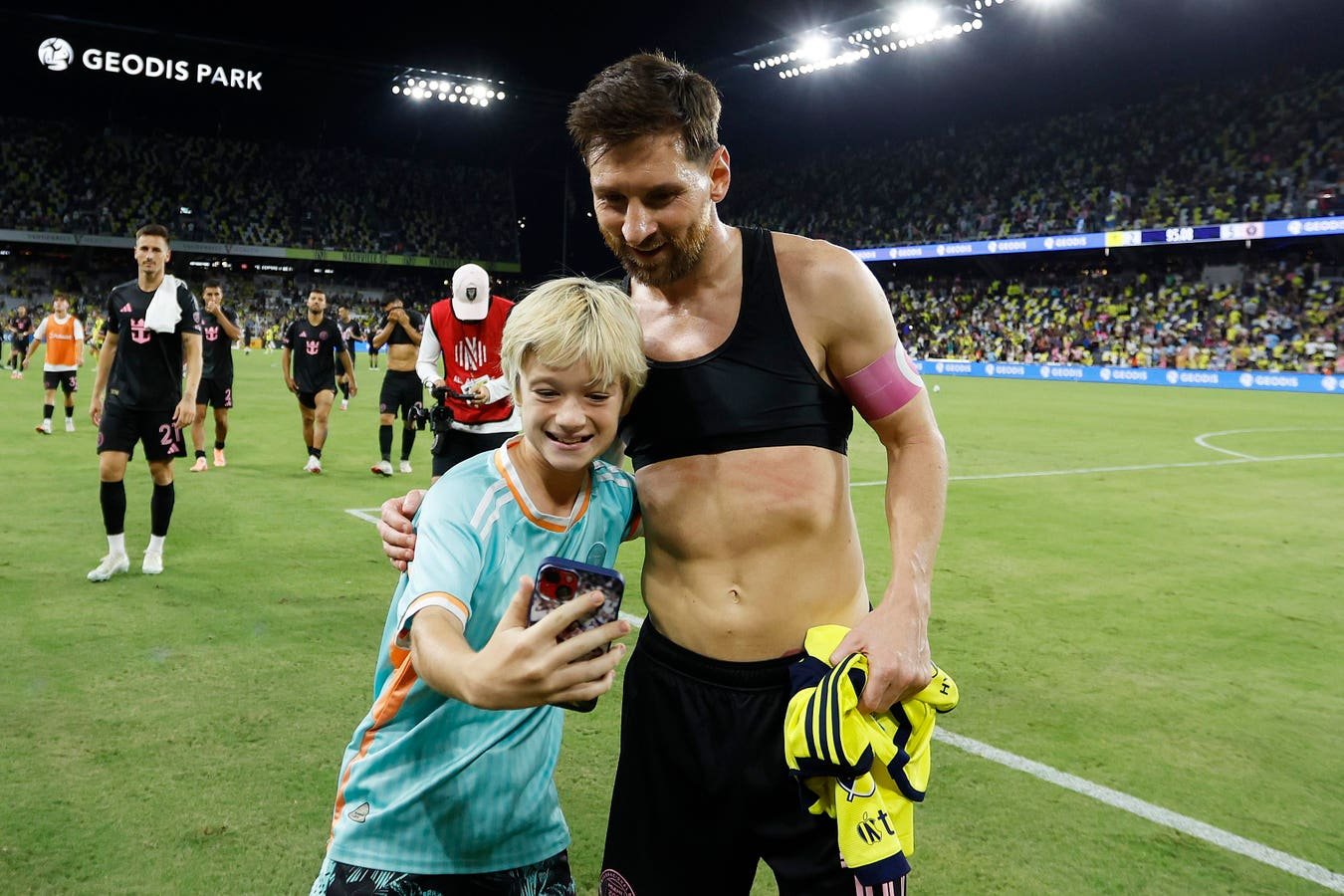 Lionel Messi del Inter Miami se toma una selfie con un aficionado que irrumpió en el campo después del partido contra Nashville SC en el GEODIS Park el sábado.