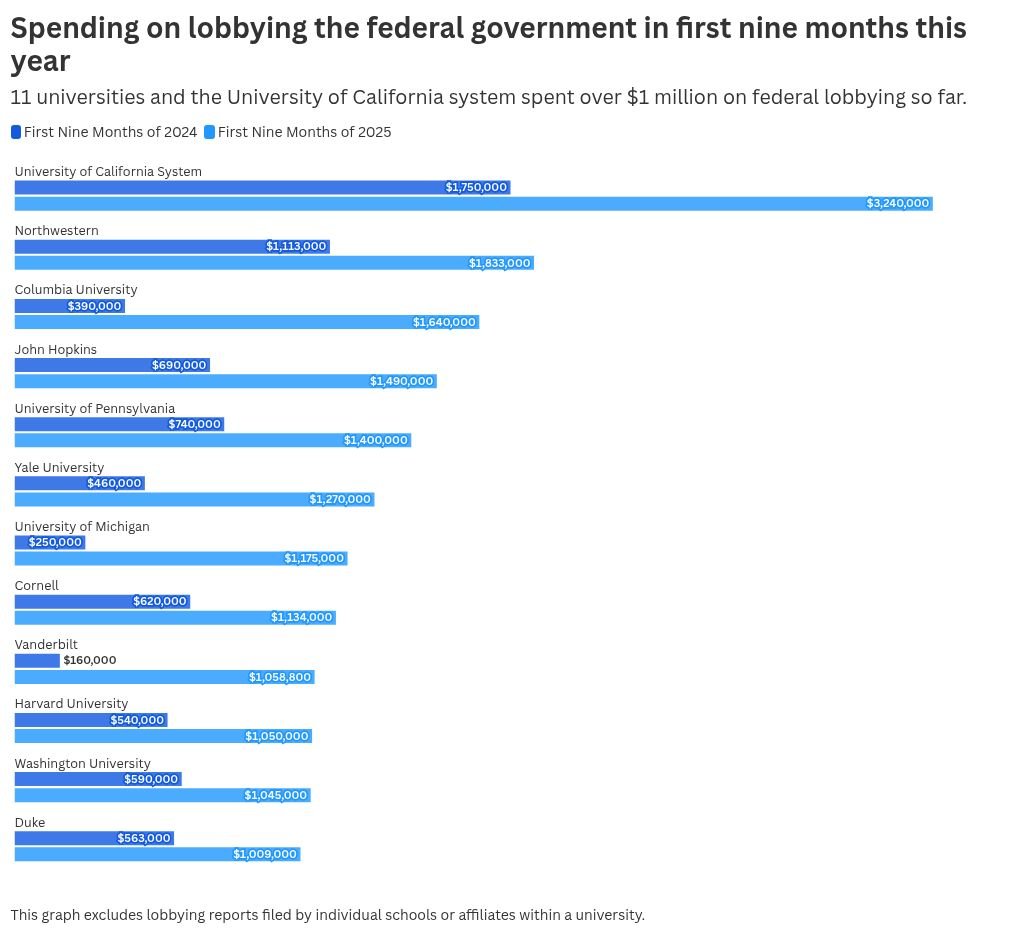 Al menos 11 universidades y el sistema de la Universidad de California (UC) desembolsaron más de 1 millón de dólares cada uno para cabildear ante el gobierno en los primeros nueve meses del año. El sistema de la UC, que incluye a la UC Berkeley y la UC Los Ángeles, gastó más de 3,2 millones de dólares este año sólo en cabildeo.