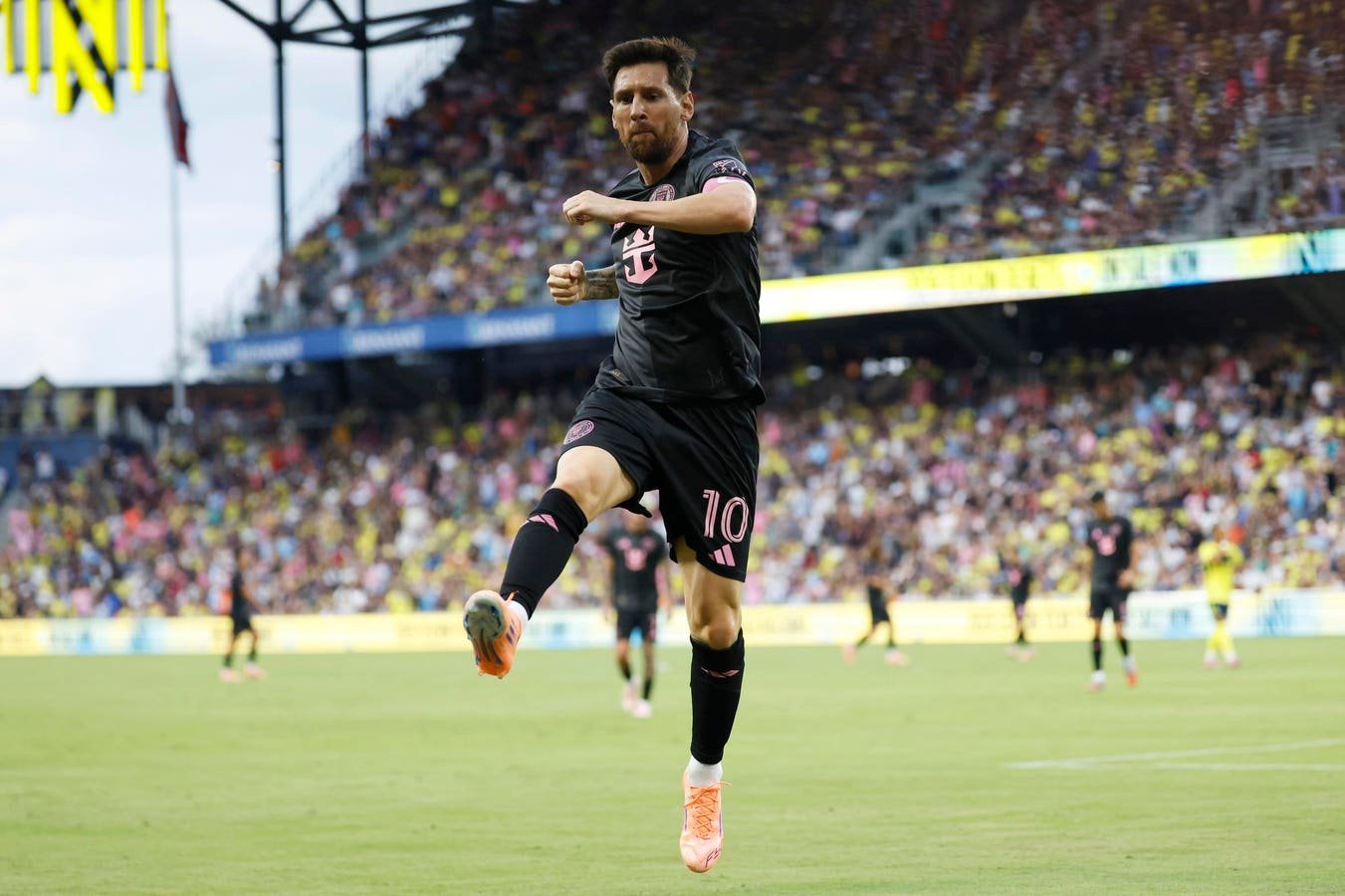 Lionel Messi #10 del Inter Miami celebra después de marcar un gol durante la primera mitad del partido contra Nashville SC el sábado.