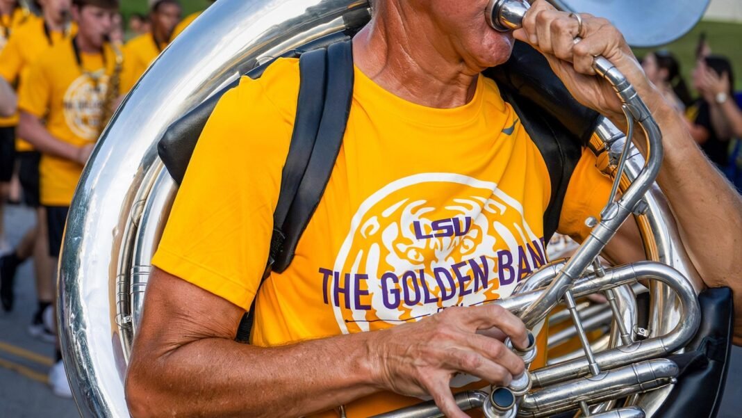 66 66 años LSU Fresman, ahora el miembro más antiguo de la banda de música y la prueba de que nunca es demasiado tarde para perseguir sus sueños.