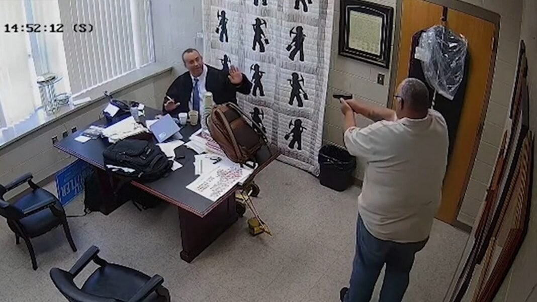 Primero recuperemos … en septiembre de 2024, cuando Mulins estaba sentado en el escritorio en su cámara Steins camina con una pistola Y filmado … cuando una cámara de seguridad capturó el rodaje en el video, que luego se publicitó. Los fiscales acusaron al antiguo asesinato del sheriff del condado de Lecher.