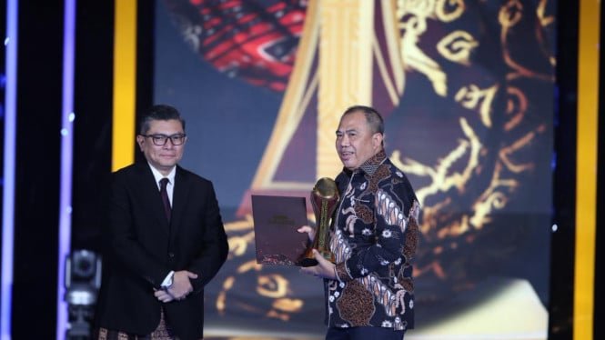 “Promoción de la silvicultura social para el bienestar público”. Mahfudz, secretario general del Ministerio Forestal, aceptó el premio el martes 25 de noviembre de 2025 en Yakarta.