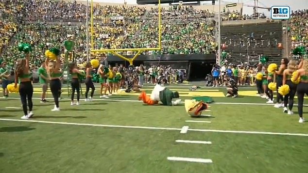 La cabeza de la mascota de Oregon cayó frente a un estadio lleno solo unos momentos antes del inicio