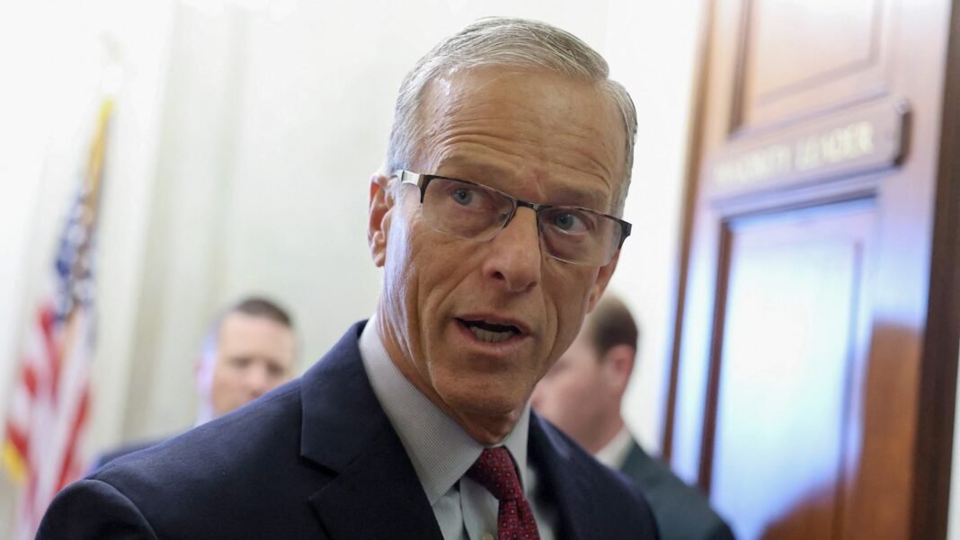 El líder de la mayoría del Parlamento John Thune habla con los periodistas en la puerta de su oficina el segundo día del día de cierre parcial del gobierno federal en el Capitolio de los Estados Unidos en Washington, el 2 de octubre de 2025.