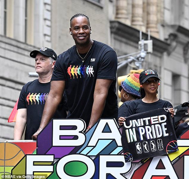Jason Collins cuando participa en NBA/WNBA en el Desfile del Orgullo de la Ciudad de Nueva York en 2024