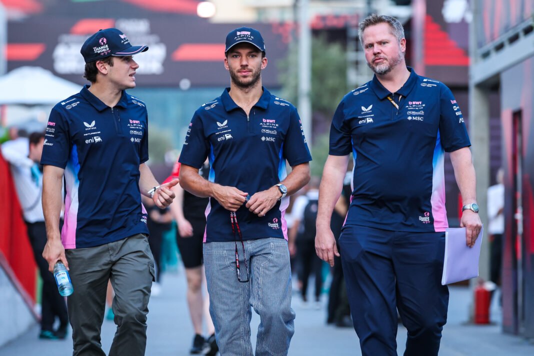 Argentina Franco Kalpinto y Alpine F1 Tim Pierre Gaslie en Francia y Alpine F1 Tim Pierre Gasley y la almohadilla para caminar del Gran Premio F1 de Azerbaiyán con un miembro de la tripulación después de la práctica …