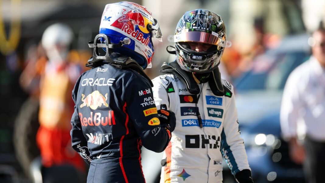 AUSTIN, TEXAS – 17 DE OCTUBRE: Max Verstappen, de Holanda, clasificado para la Sprint Pole, y Oracle Red Bull Racing, y Oscar Piastri, tercer clasificado de Sprint, de Australia, y McLaren se felicitan mutuamente en la clasificación durante la clasificación de Sprint antes del Gran Premio de Estados Unidos de F1 en el Circuito de las Américas el 17 de octubre de 2025 en Austin, Texas. (Foto de Mark Thompson/Getty Images)