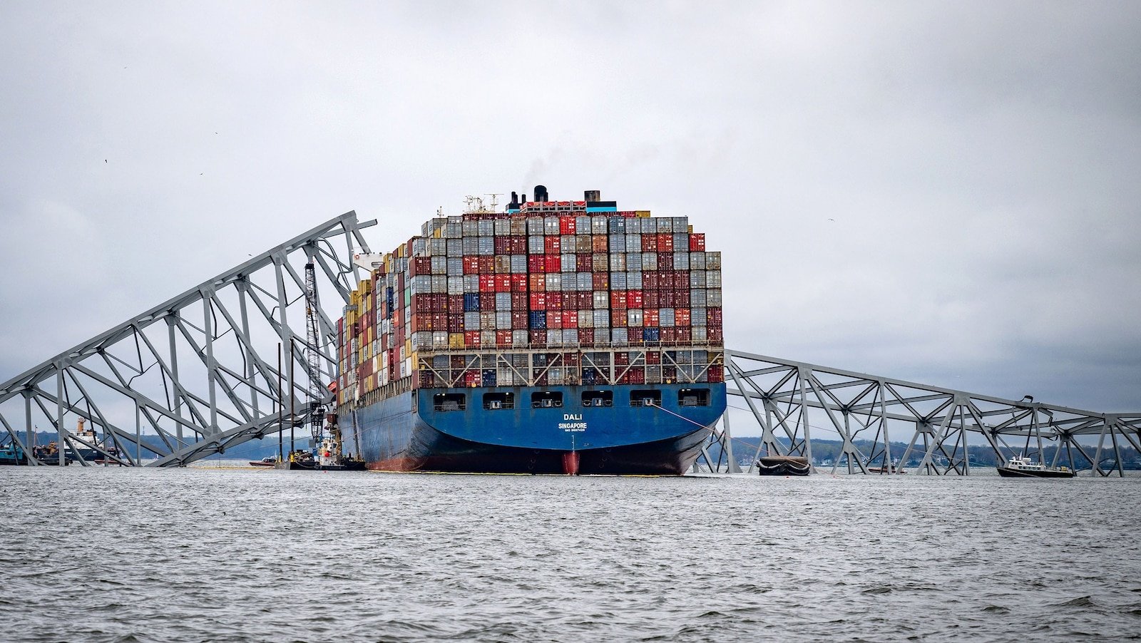 En este archivo de imagen del 1 de abril de 2024, se ve el portacontenedores Dali en el puente clave naufragado de Francis Scott casi una semana después de que chocó contra un muelle estructural, lo que provocó la caída de un puente.