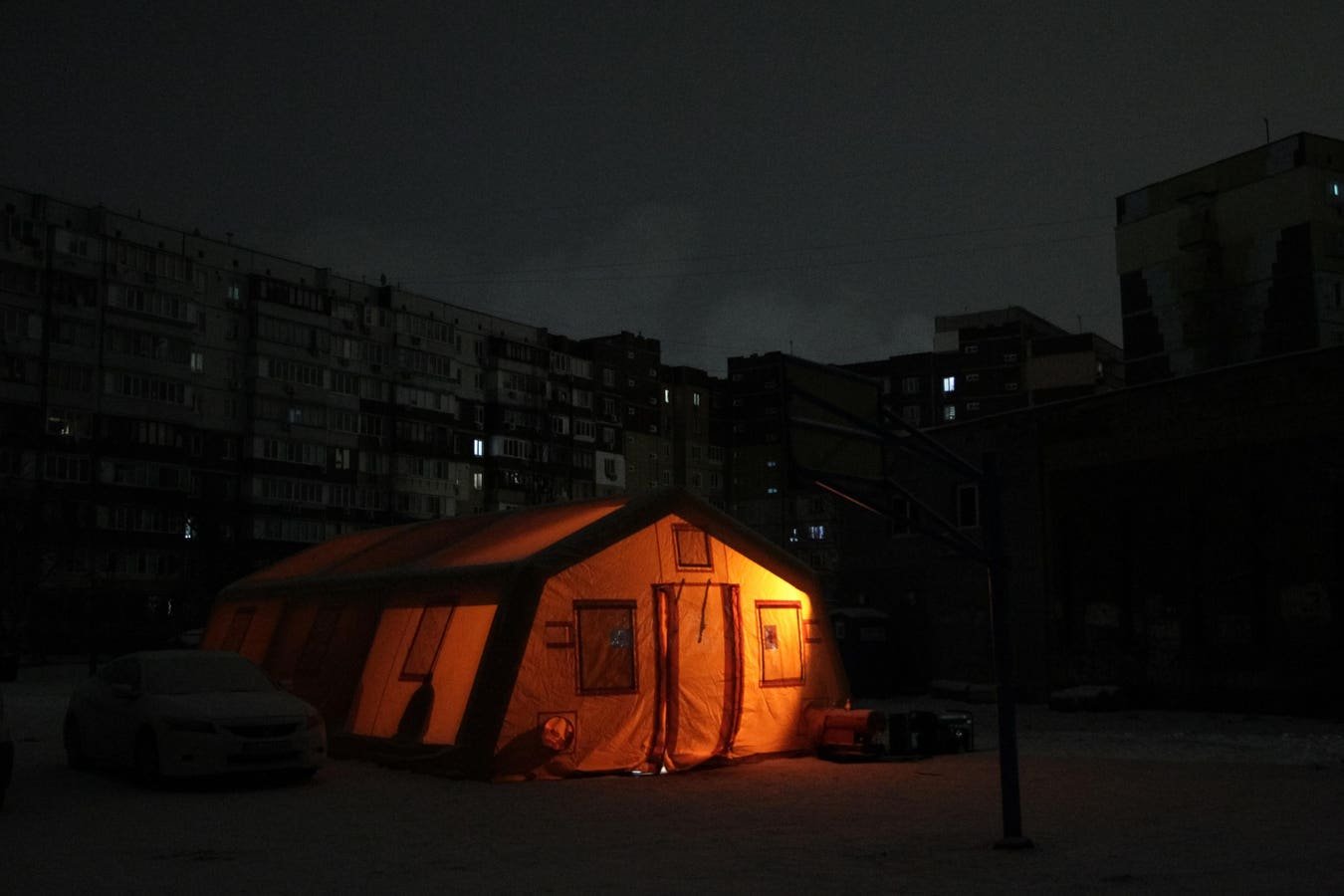 Una tienda de campaña con calefacción en el distrito Desnianskyi de Kiev, Ucrania, el 13 de enero de 2026 durante un corte de energía.