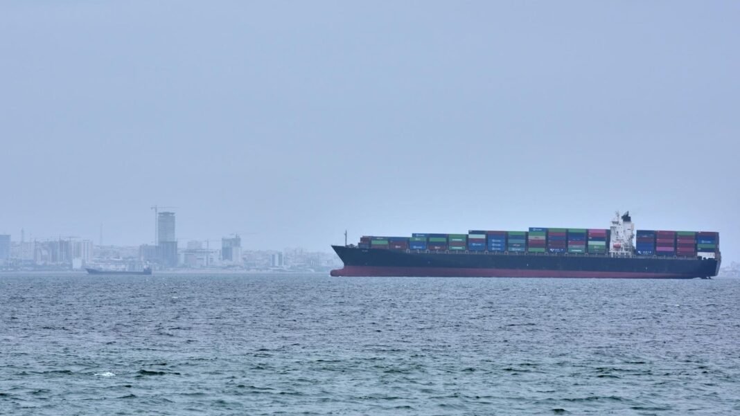 Se ve un barco portacontenedores en el estrecho de Ormuz frente a la costa de la isla de Qeshm, Irán.