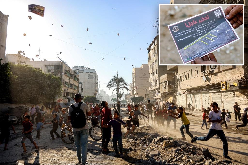 Los palestinos que viven en las ruinas de Gaza fueron bombardeados en folletos israelíes el martes, Israel dijo que estaba a punto de abolir el área en un ataque para borrar a Hamas.