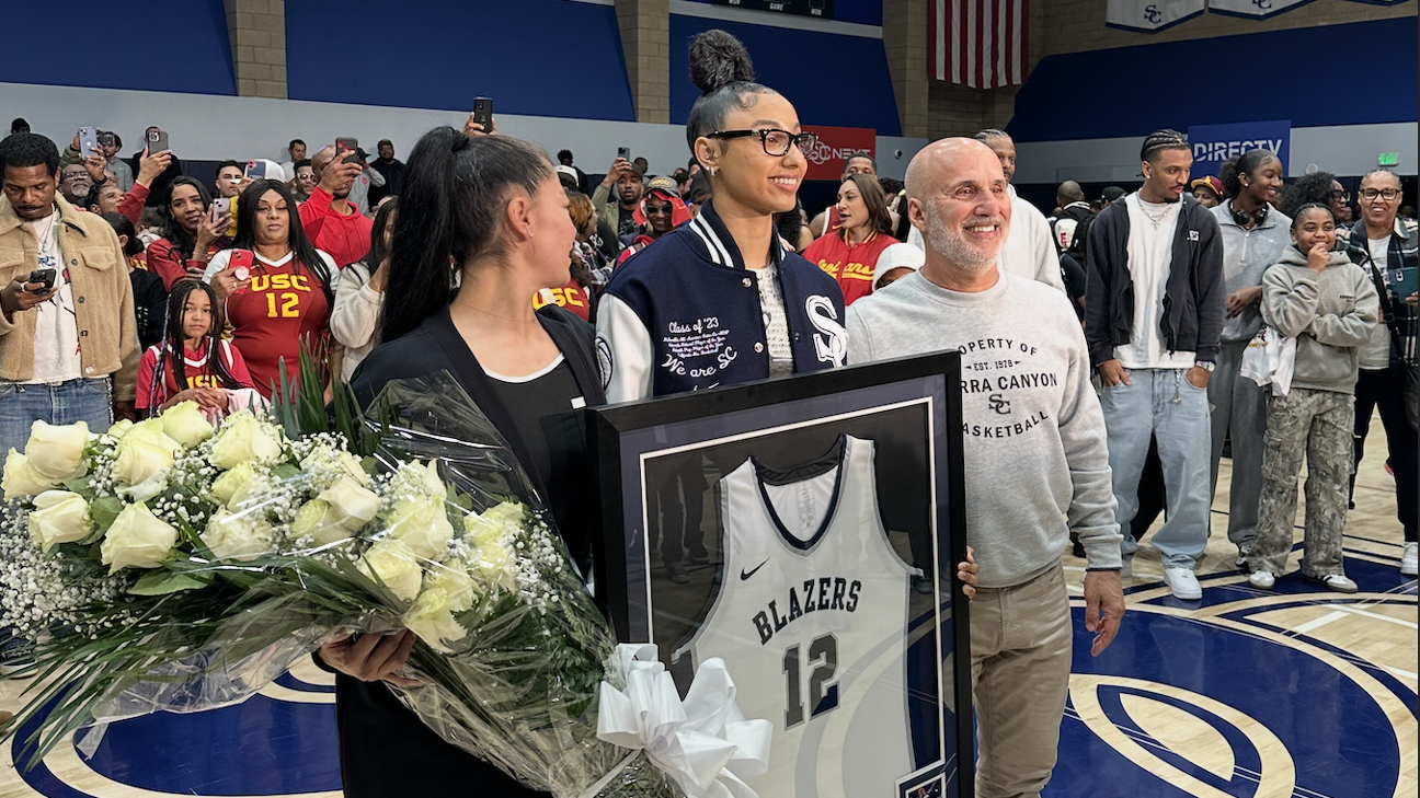 La estrella del baloncesto femenino de los Trojans de USC, Juju Watkins, se convirtió en la primera atleta en la historia de la escuela secundaria Sierra Canyon en retirar su camiseta el viernes por la noche.