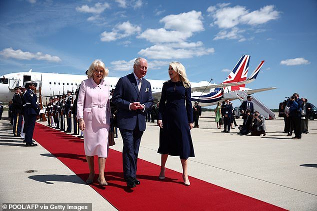Cuando el avión real aterrizó bajo un sol brillante en la Base Conjunta Andrews en las afueras de la capital, el Rey y la Reina fueron recibidos por la Jefa de Protocolo de los Estados Unidos, la Embajadora Monica Crowley, y Su Excelencia el Embajador en los Estados Unidos, Sir Christian Turner, quien se había lanzado en paracaídas después de la nave estelar de Manclers antes del Día de Mancal en febrero.
