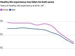 En el Reino Unido, la esperanza de vida saludable ha caído de unos 63 años hace una década a 60,7 años para los hombres y 60,9 para las mujeres en 2022-24.