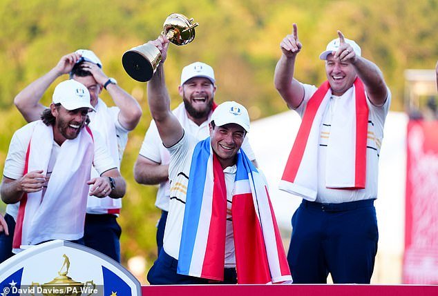 Hovland se unió a la celebración de Europa después de su histórica conquista de Tihasik y se enojó con los fanáticos estadounidenses y señaló su cuello antes de elevar el famoso trofeo en alto.