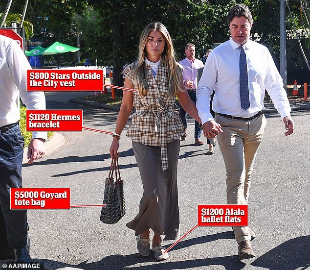 Cuatro días de juicio de Matt Wright en Darwin, Outback Rangler, trajo a su esposa, Kaiya, que usa $ 800, un brazalete Hermis White Hermis de $ 1120 y un zapato plano de ballet Aliya $ 1200 y una bolsa Gird Gird de 5000 dólares.