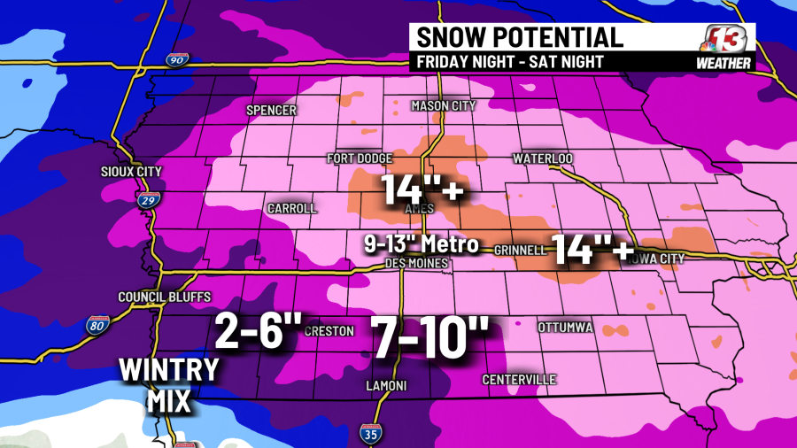 Las áreas rosadas, incluida el área Metro Des Moines, verán entre 8 y 12 ″ con cantidades mayores aisladas. Es probable que las áreas naranjas de Fort Dodge y Ames y Iowa Falls vean sumas de más de 13 ″… tal vez hasta 16 ″. Nuevamente, estos serán los totales alrededor de la medianoche del sábado/domingo.