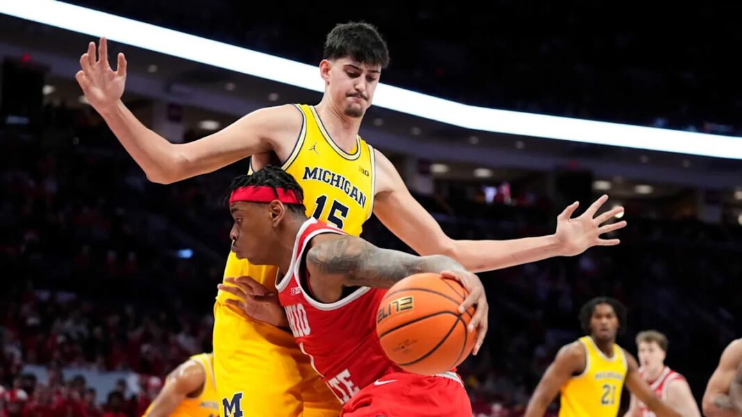 El pívot de Michigan, de 7 pies 3 pulgadas, anotó los primeros dos triples de su carrera universitaria el domingo. Los Wolverines, que ocupan el segundo lugar en el ranking, vienen de una victoria por 82-61 sobre Ohio State.