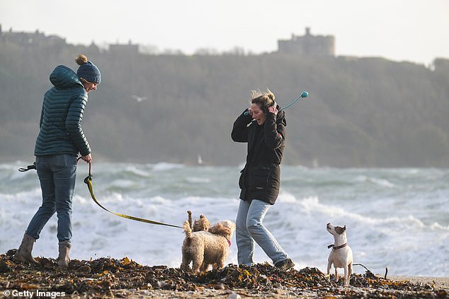 Paseadores de perros con fuertes vientos en la playa de Gillingwes en Falmouth, Cornwall esta mañana