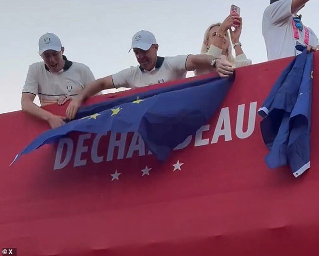 Un video del momento mostró que el equipo estaba parado en la pasarela entre la casa club de Europa y la primera T. cuando Mattzpatrick alentó a su compañero de equipo a dibujar la bandera a nombre de Decambau (que fue escrita en la estructura junto con sus compañeros de equipo).
