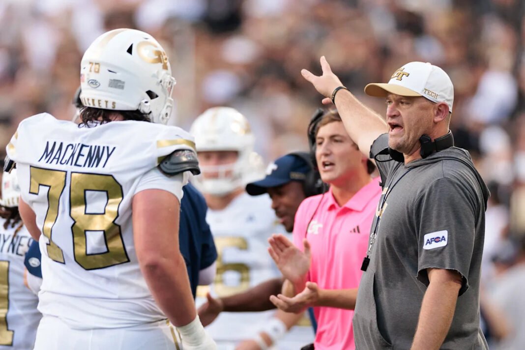 El entrenador en jefe de Georgia Tech, Brent Key, es un juego de fútbol universitario de la NCAA el viernes 29 de agosto de 2025, Color Boulder (AP Photo/David Jaluboski)