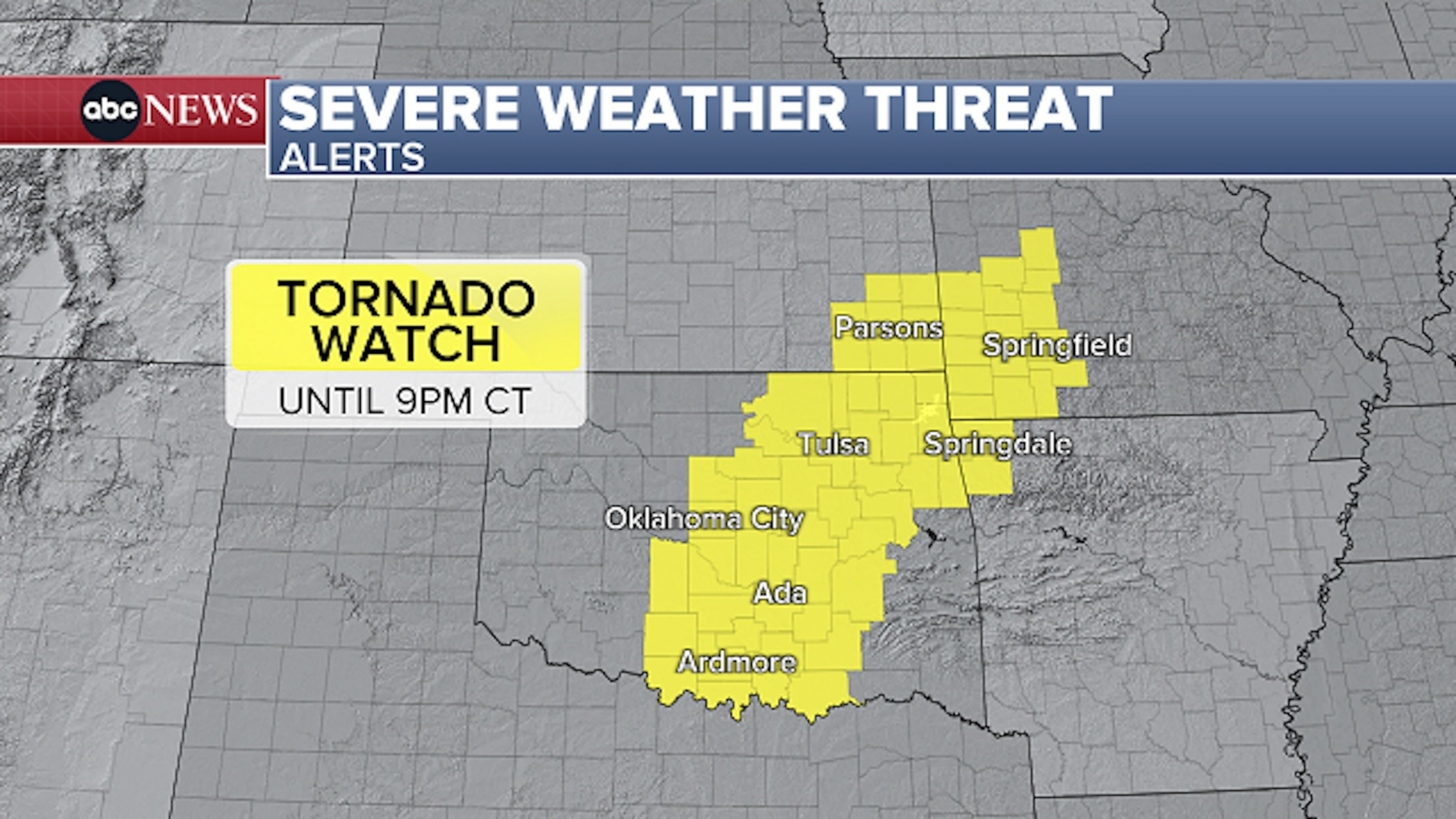 Una alerta de tornado estuvo vigente para partes de Oklahoma, el sureste de Kansas, el sur de Missouri y el noroeste de Arkansas hasta al menos las 9 pm CT.