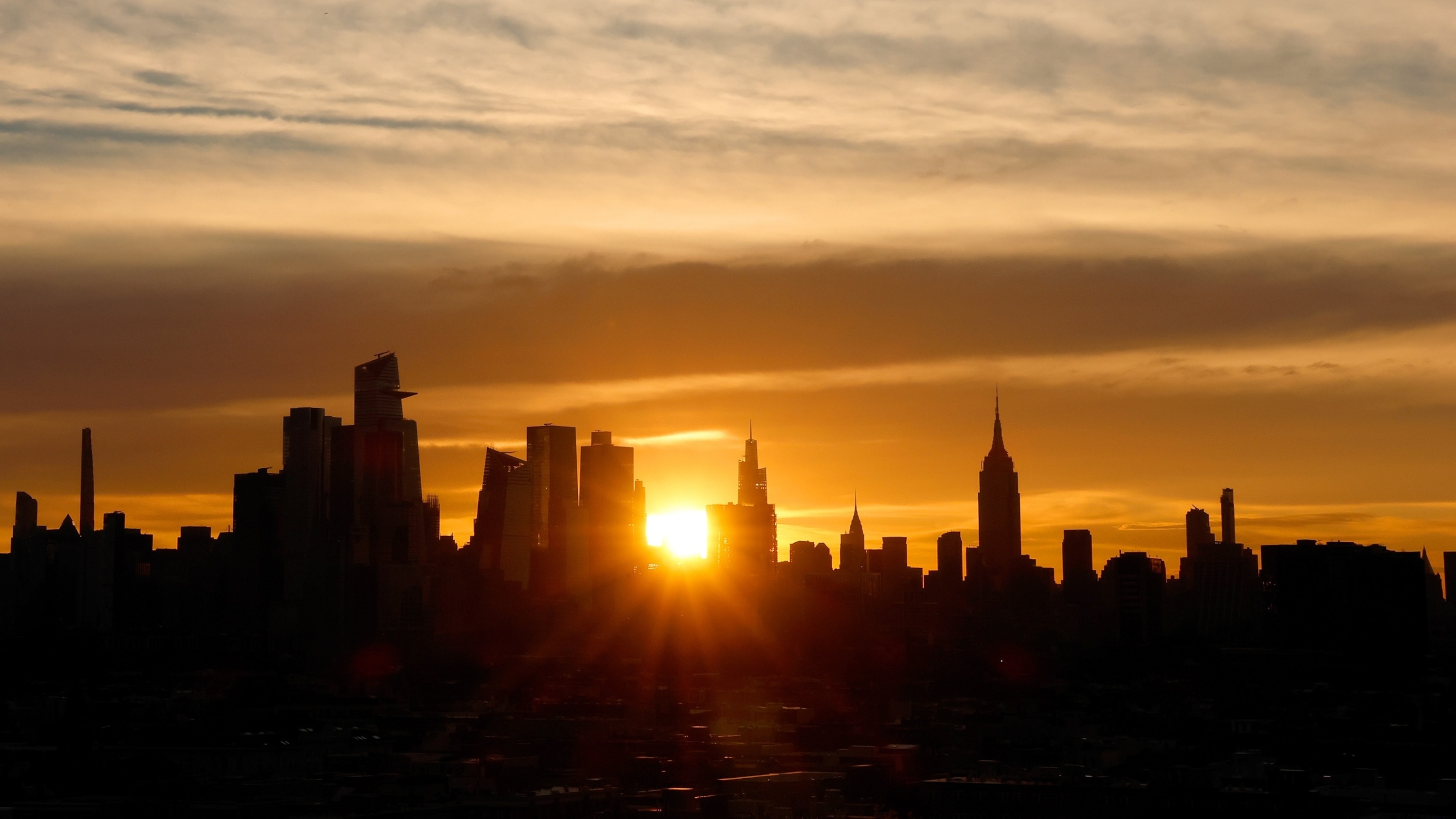 El sol sale detrás del horizonte del centro de Manhattan y del Empire State Building en la ciudad de Nueva York, el 15 de abril de 2026.