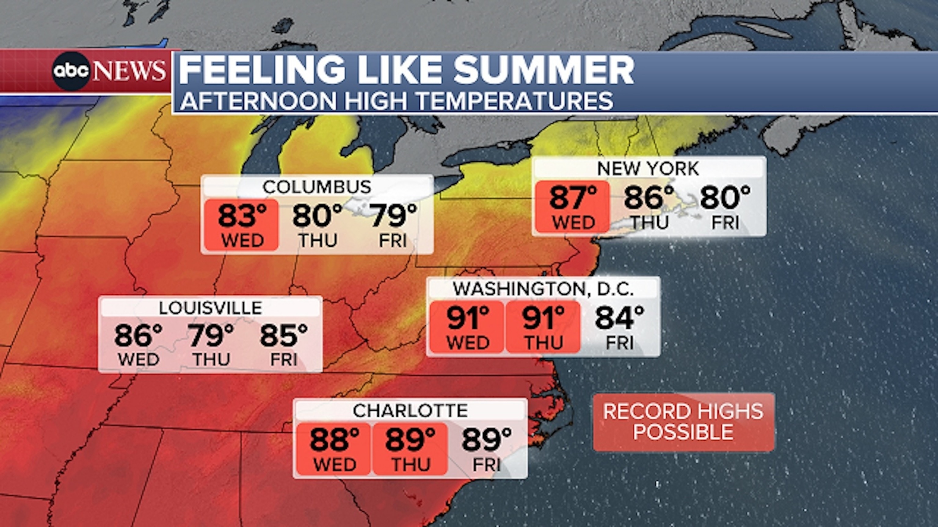 El miércoles por la tarde, las temperaturas subieron hasta los 80 grados y bajaron los 90 grados a lo largo del corredor I-95 desde Washington, DC hasta Filadelfia y la ciudad de Nueva York, rompiendo récords diarios en las tres ciudades.